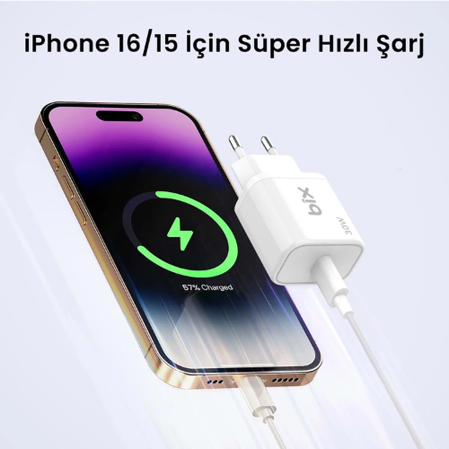 Bix BXPD31 30W USB-C PD 3.0 Akım Korumalı Hızlı Şarj Adaptörü Beyaz