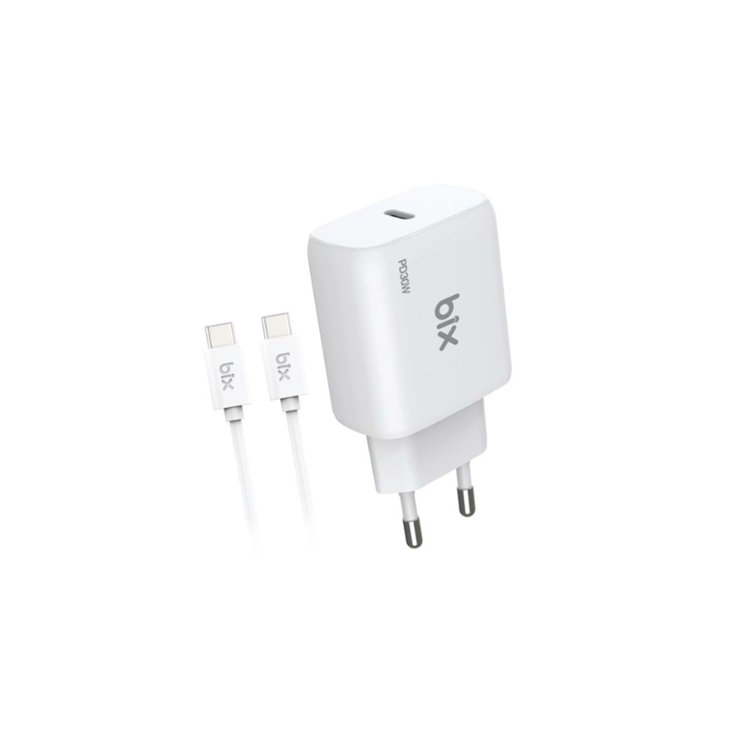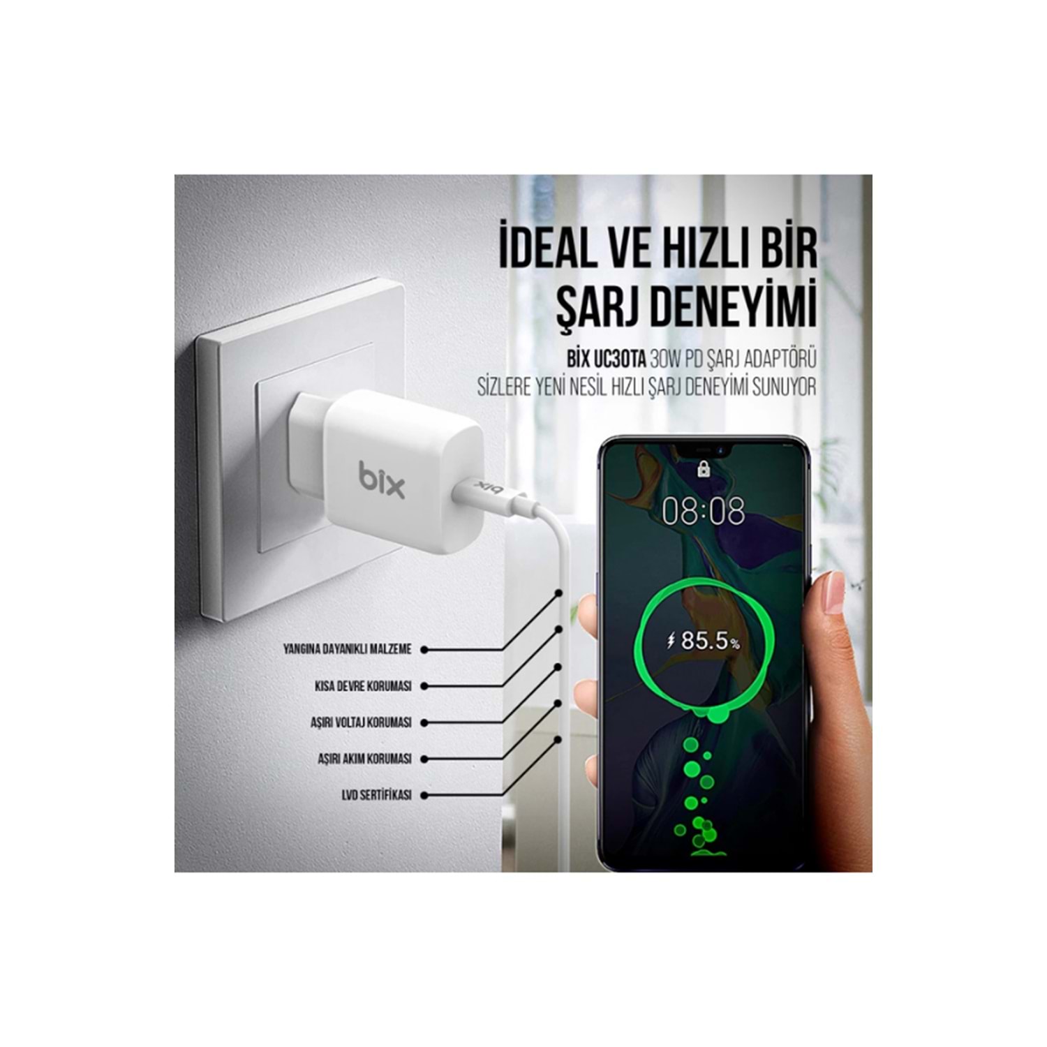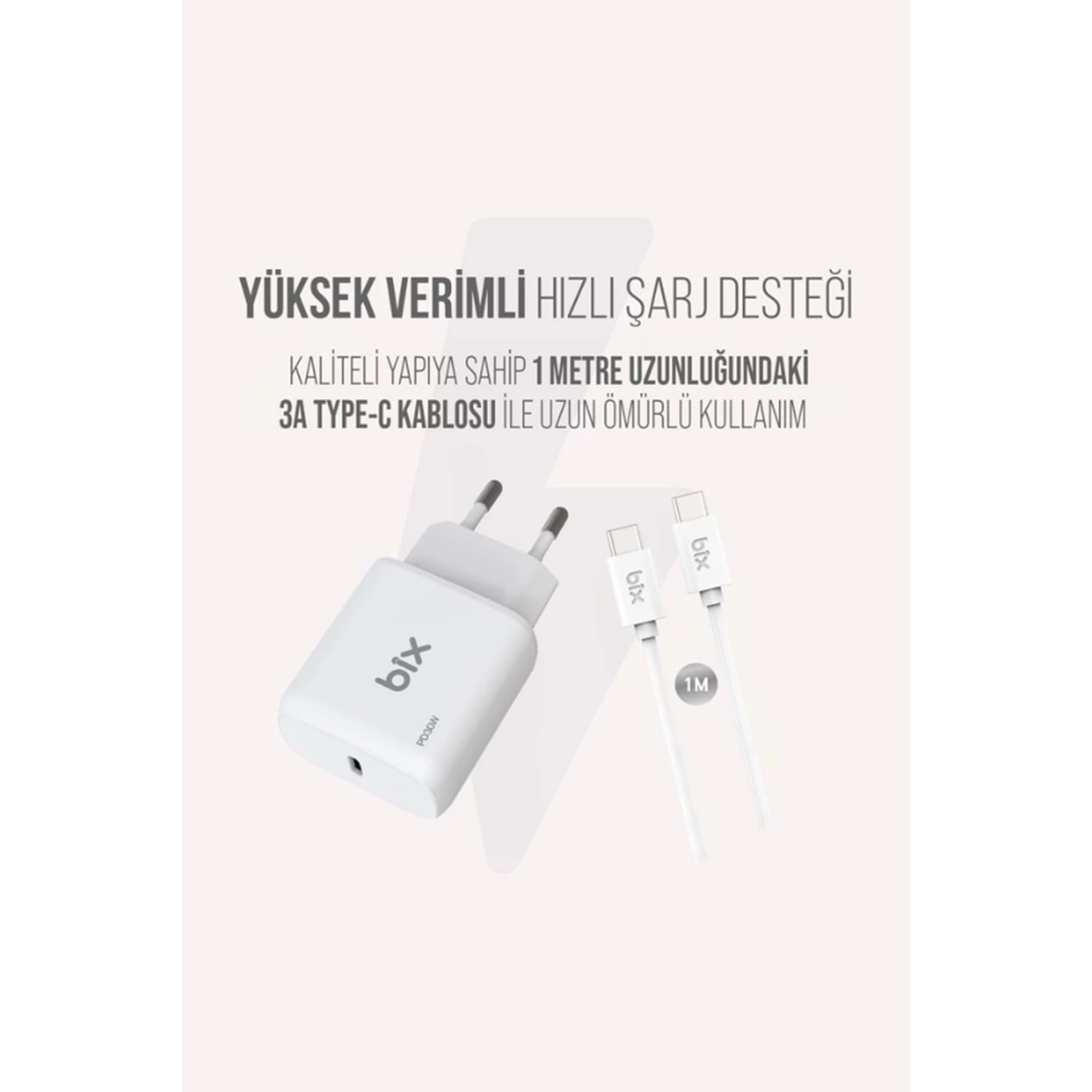 Bix BXUC30TA 30W Type-C PD 3.0 Hızlı Şarj Adaptörü ve 1 Metre 3A Type-C Şarj Kablosu Beyaz