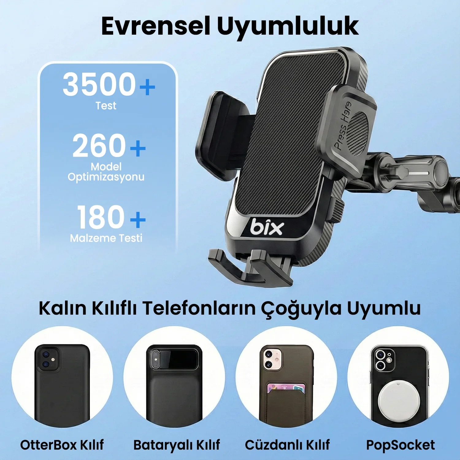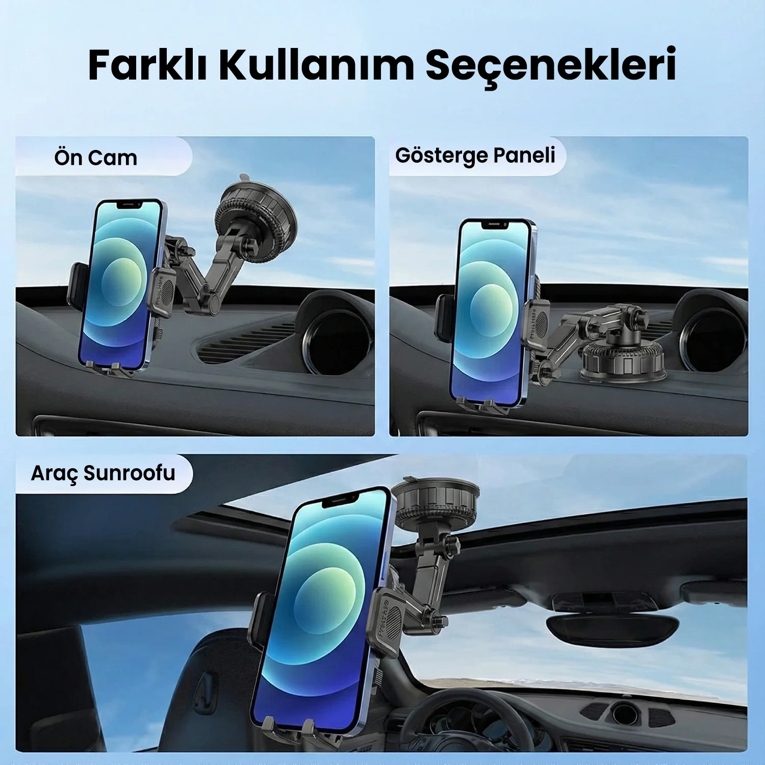 BİX BXCH15 Uzayabilen ve Ayarlanabilir Cam, Torpido ve Ön Panel için Çok Fonksiyonlu Araç içi Vantuzlu Telefon Tutucu Siyah